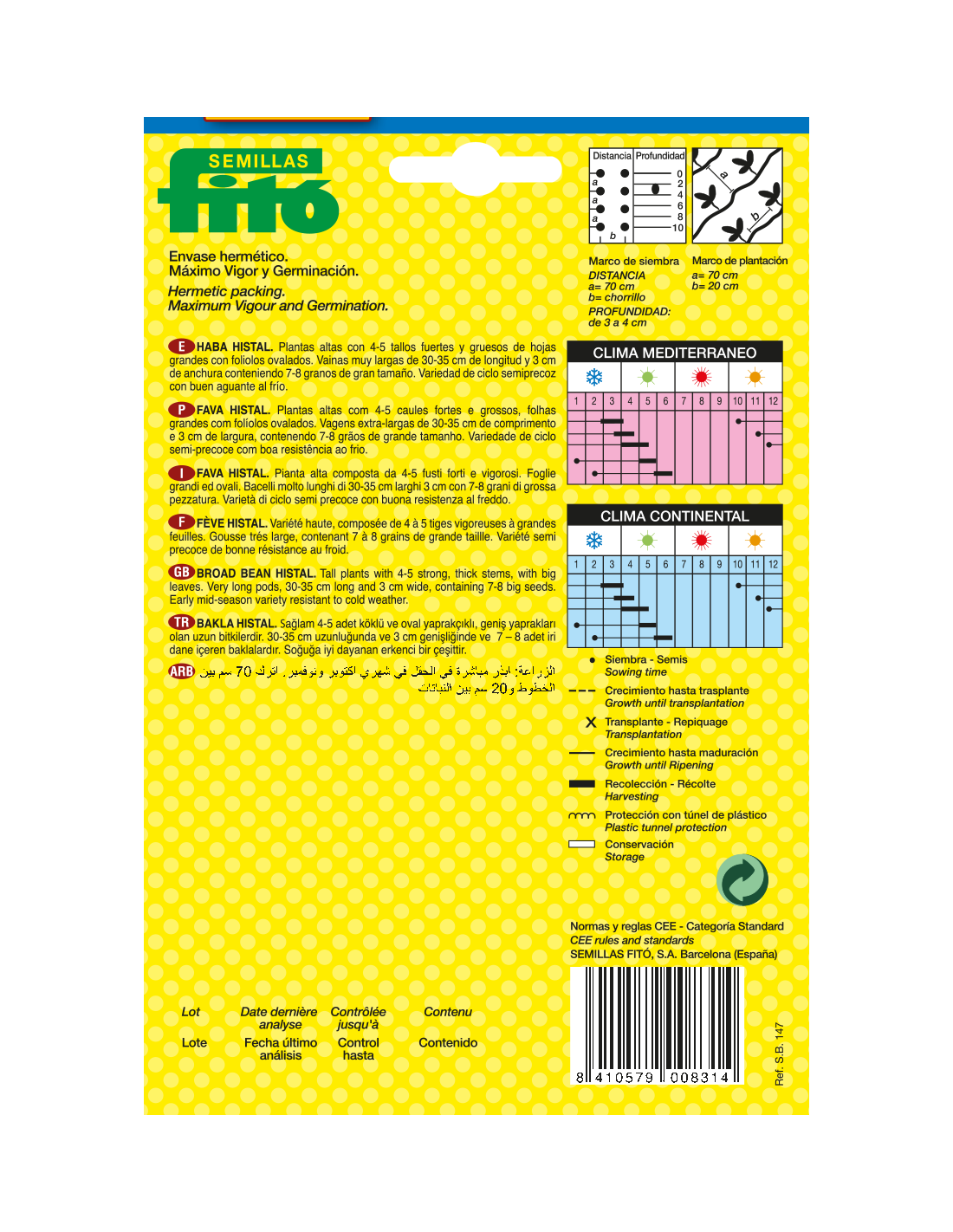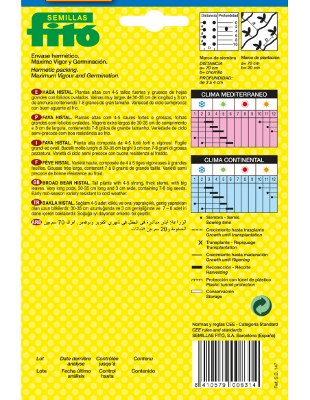 Traditional broad bean spring crop. FITÓ's own extraction from the Aguadulce bean. Tall plants, with 4-5 thick and strong stalks, large leaves with oval leaflets. One of its main traits are their extra-long pods, 30-33 cm. And 3 cm. Wide and they contain 7-8 large seeds. It's a semi-early variety which can resist the cold