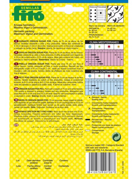 Pea medium size. Plant with a height of 75 cm and white flowers. This variety is resistant to powdery mildew and very productive. Mangetout type pods that are 9-10 cm long and 2-2.5 cm wide. Ideal for raw consumption in salads or sauteed in a wok. Sowing: directly. Sown in autumn/winter.