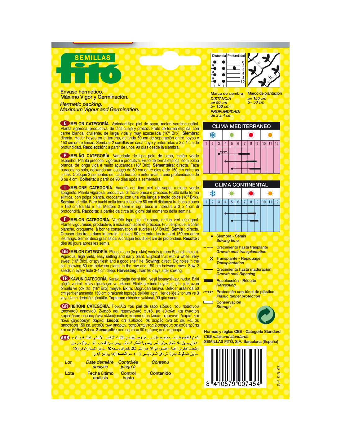 Variedad tipo piel de sapo, melón verde español. Planta vigorosa, productiva, de fácil cuaje y precoz. Fruto de forma elíptica, con carne blanca, crijiente, de larga vida y muy azucarada (16ª Brix).
