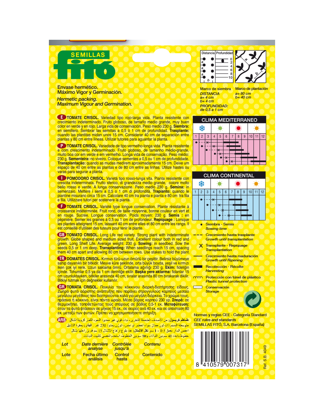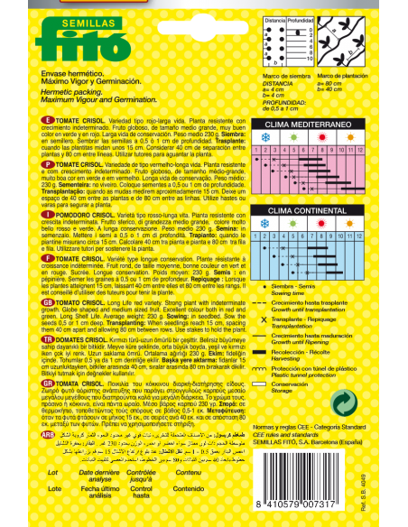 Variedad tipo rojo-larga vida. Planta resistente con crecimiento indeterminado. Fruto globoso, de tamaño medio grande, muy buen color en verde y en rojo.Larga vida de conservación. Peso medio 230 gr.