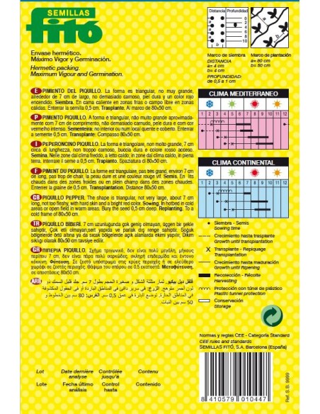 La forma es triangular, no muy grande, alrededor de 7 cm de largo, no demasiado carnoso, piel dura y un color rojo encendido. Siembra. En cama caliente en zonas frías o campo libre en zonas cálidas. Enterrar la semilla 0,5 cm. Trasplante. Al marco de 80x50 cm.