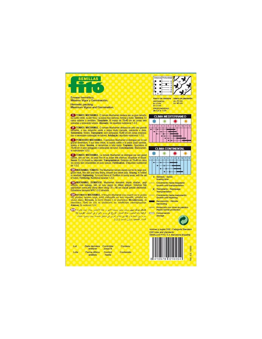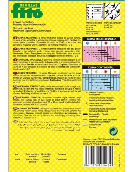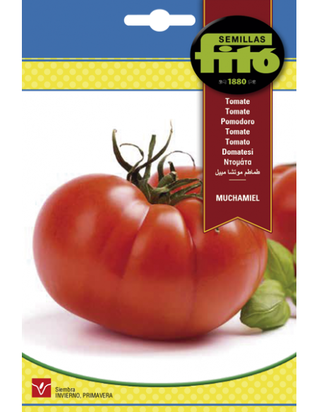 El tomate Muchamiel destaca por su gran tamaño, su cuello verde, su piel fina y su pulpa muy carnosa, melosa y dulce. Siembra. En cama caliente o semillero. Trasplante. Al marco de 70x40 cm en zonas bien soleadas y colocando tutores. Abonado. De equilibrio nutricional 1-2-2.