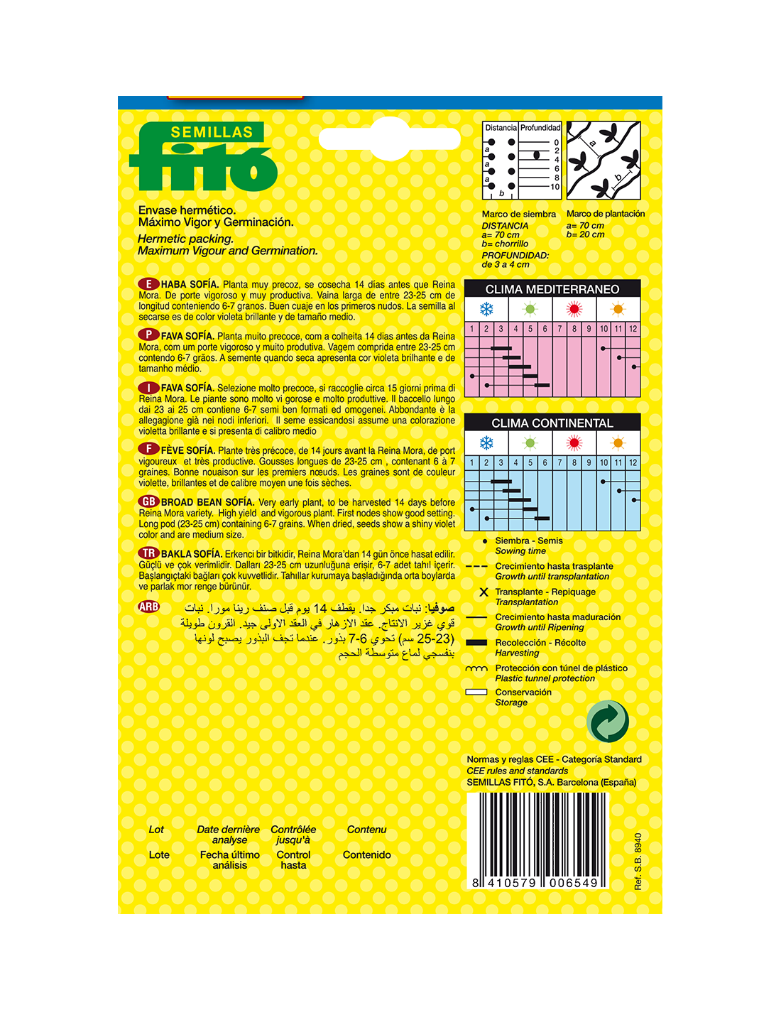 Tradicional cosecha primavera. Se trata de una obtención propia FITÓ a partir de la haba Reina Mora. Tipo Muchamiel. Las vainas son largas, de 23-25 cm. de longitud, conteniendo 6-7 granos. Es una variedad muy productiva y la más precoz de las variedades de primavera. Le gana unos 15 días en precocidad a la habla Reina Mora. La semilla al sacarse es de color violeta brillante y de tamaño medio.