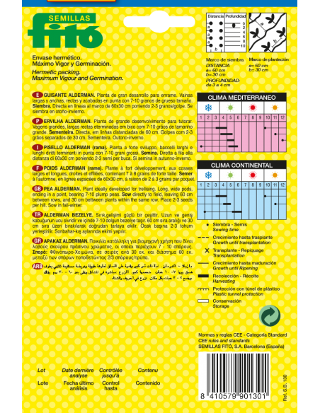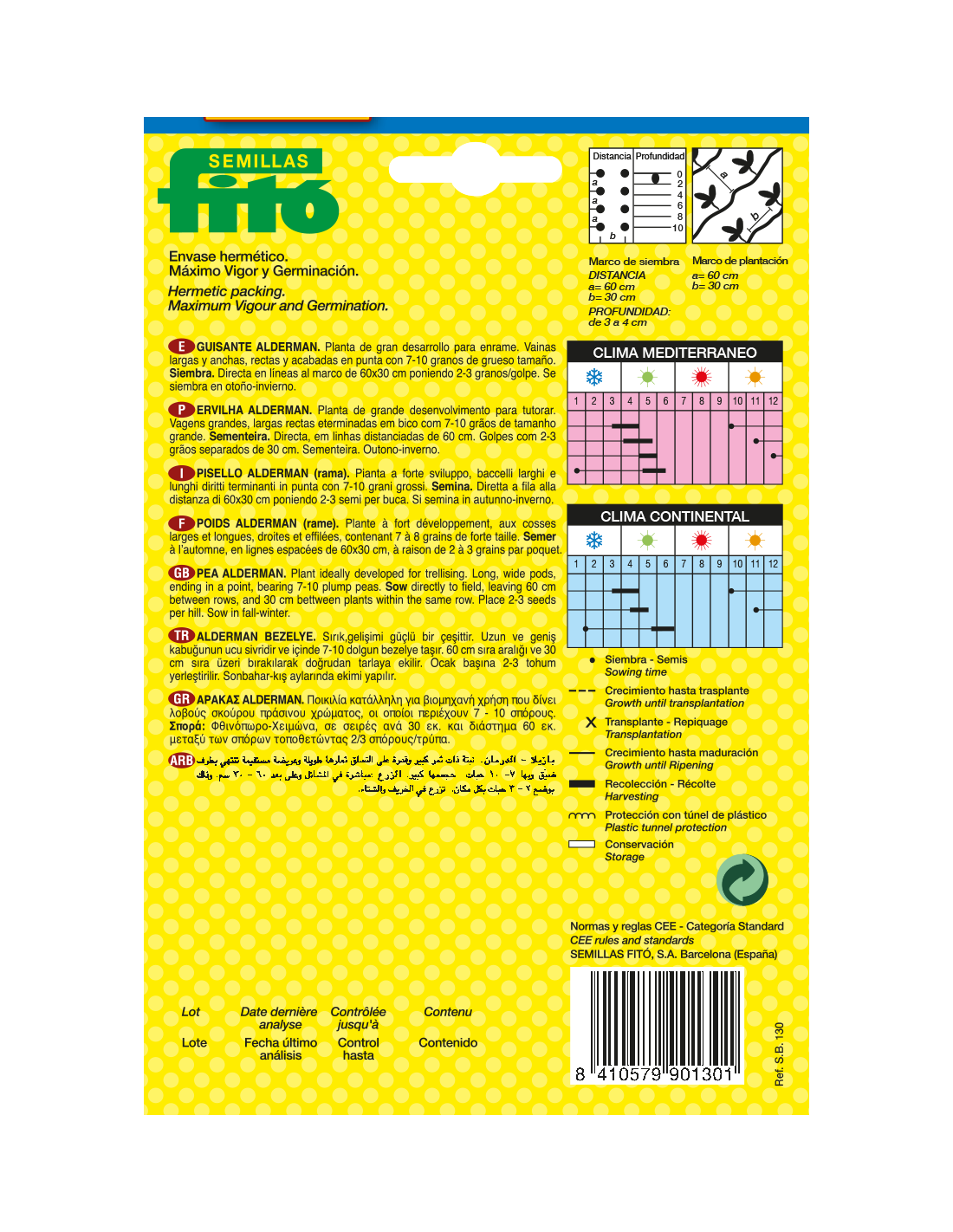 Mata alta. Plantas de 150cm de altura, de enrame. Necesita tutor. Vainas de unos 12-13cm de longitud, rectas y anchas. El grano es rugoso color crema.
