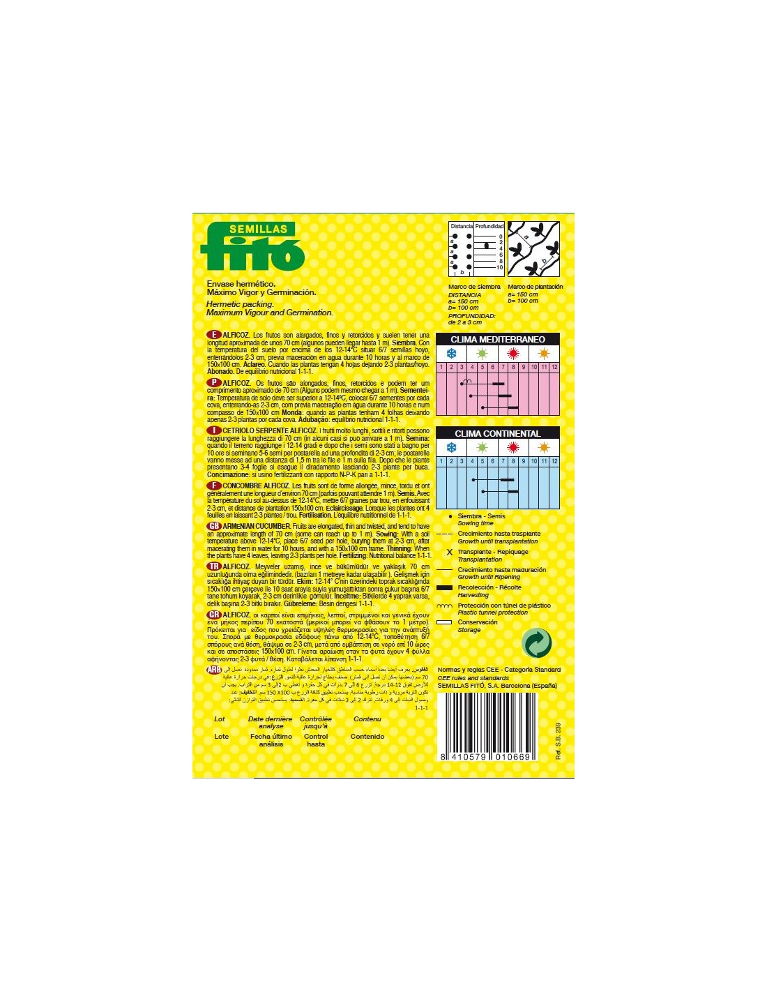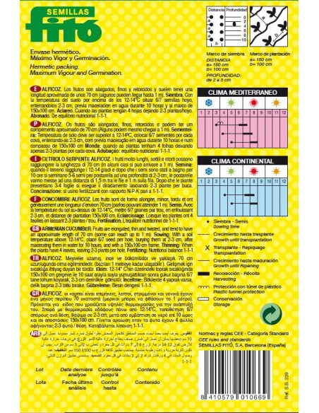 Los frutos son alargados, finos y retorcidos y suelen tener una longitud aproximada de unos 70 centímetros (algunos pueden llegar hasta 1 metro). Se trata de une especie que necesita temperaturas cálidas para su desarrollo, Siembra. Con la temperatura del suelo por encima de los 12-14 °C situar 6/7 semillas hoyo, enterrándolos 2-3 cm, previa maceración en agua durante 10 horas.