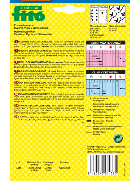 Mata media. Planta de unos 70-80cm de altura. Se trata de una selección propia de FITÓ que destaca por la homogeneidad y calidad de las vainas: son más largas y dan 8-9 granos de color verde oscuro, calibre grueso y sabor dulce. También destaca por su gran productividad. Es la variedad líder en ventas en su especie.